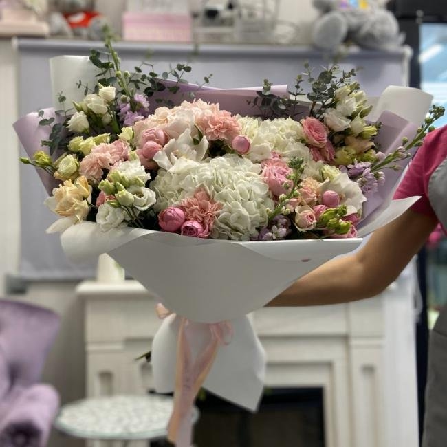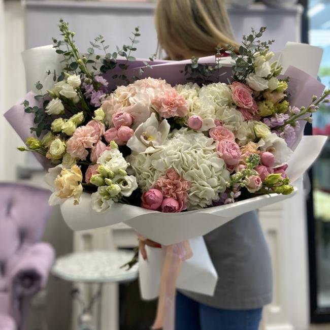 Описание В составе сборного букета: гортензия, пионовидная кустовая роза, орхидея, диантус, матиолла, эустома, эвкалипт.
