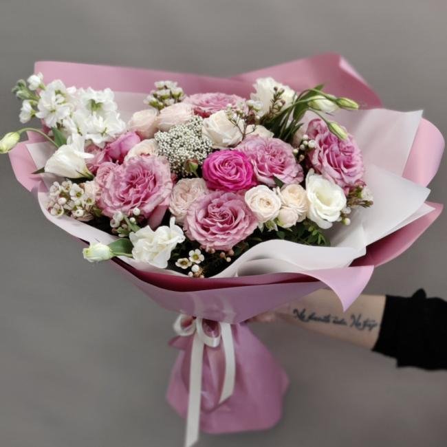 Описание В составе сборного букета: одноголовая и кустовая роза, хамелациум, матиолла, эустома.