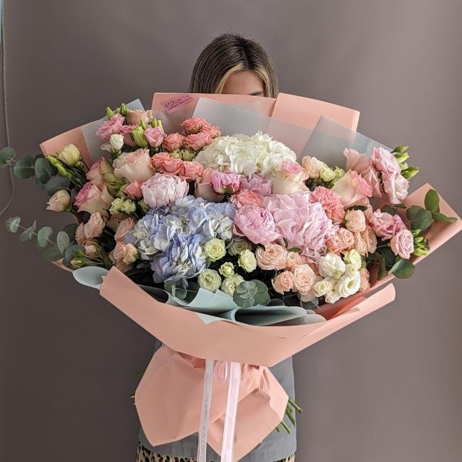 Описание В составе сборного букета: гортензия, пионы, одноголовая и кустовая роза, эустома, эвкалипт.