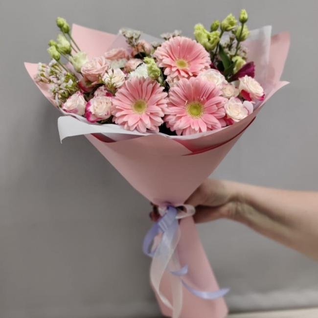 Описание В составе: гербера, кустовая роза, эустома, хамелациум.
