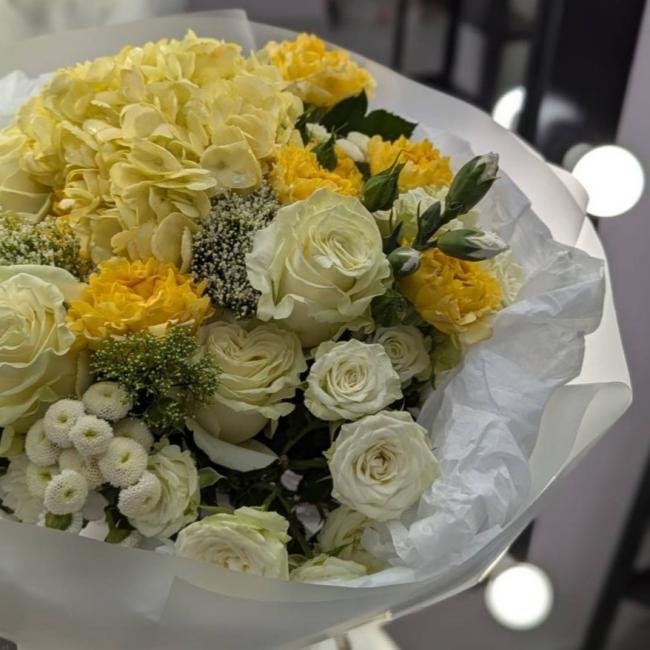 Описание В составе: гортензия, кустовая роза, одноголовая роза, кустовая хризантема, сантини, зелень