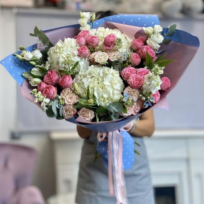 Описание В составе: гортензия, пионовидная кустовая роза, альстрамерия, эустома, матиолла.