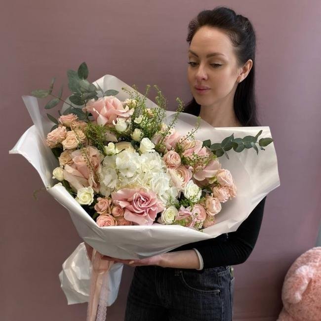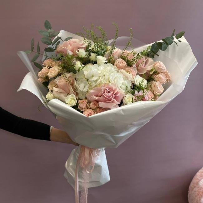 Описание В составе: гортензия, французская роза, кустовая роза, эустома, зелень