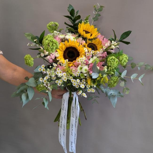 Описание В составе: подсолнух, альстрамерия, ромашки, вибурн.