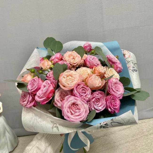 Описание Букет из кустовой розы "Венди" просто очаровательный и привлекательный! Эвкалипт идеально подчеркивает прелесть соцветий кустовой розы!