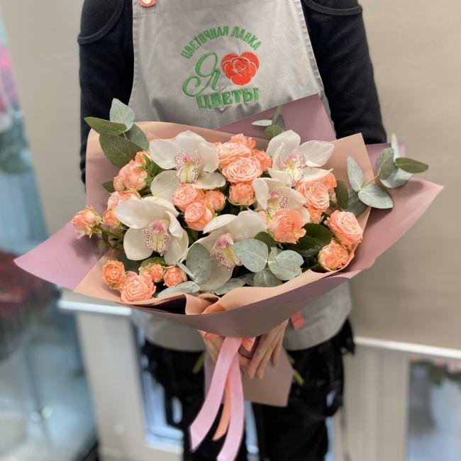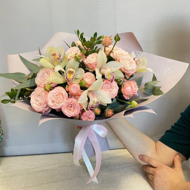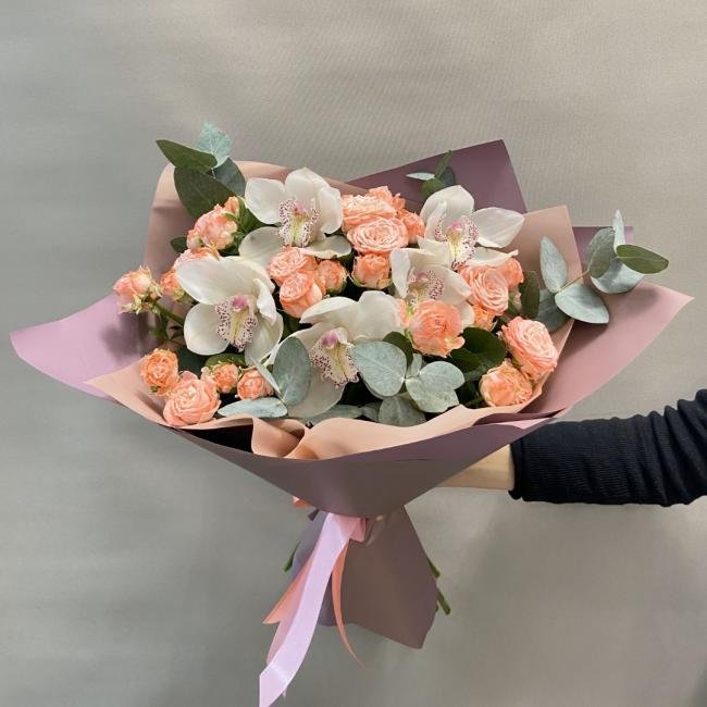 Описание Сборный букет «Одри» подчеркнут изяществом орхидей и нежностью кустовых роз. Будет по достоинству оценен любой представительницей женского пола!