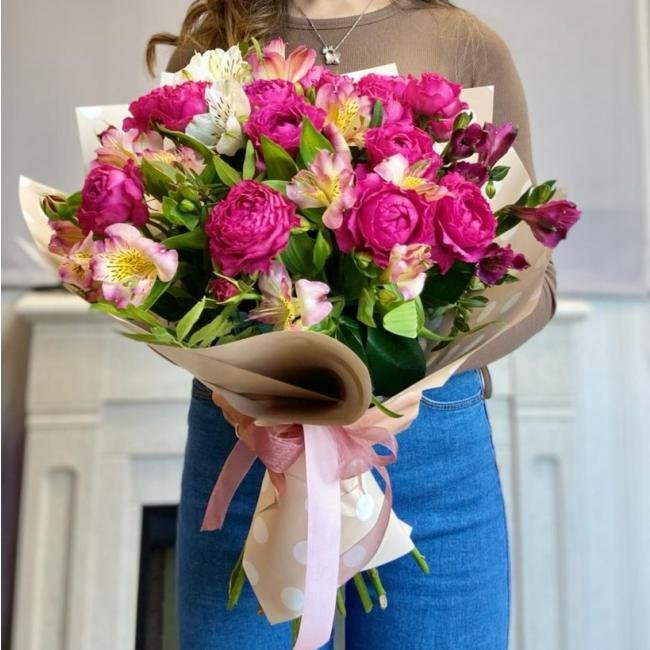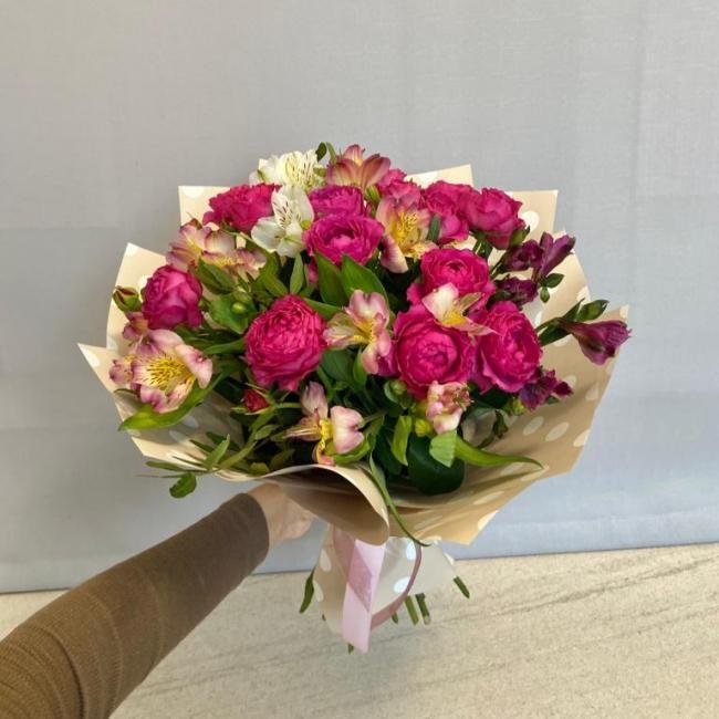 Описание Сборный букет "Джессика" притягивает внимание! Вы и Ваш букет не останетесь не замеченными! Сочетание кустовой розы и альстромерии выглядит ярко, стильно, благородно! Такой букет украсит любое событие в Вашей жизни! Может быть в разных оттенках!