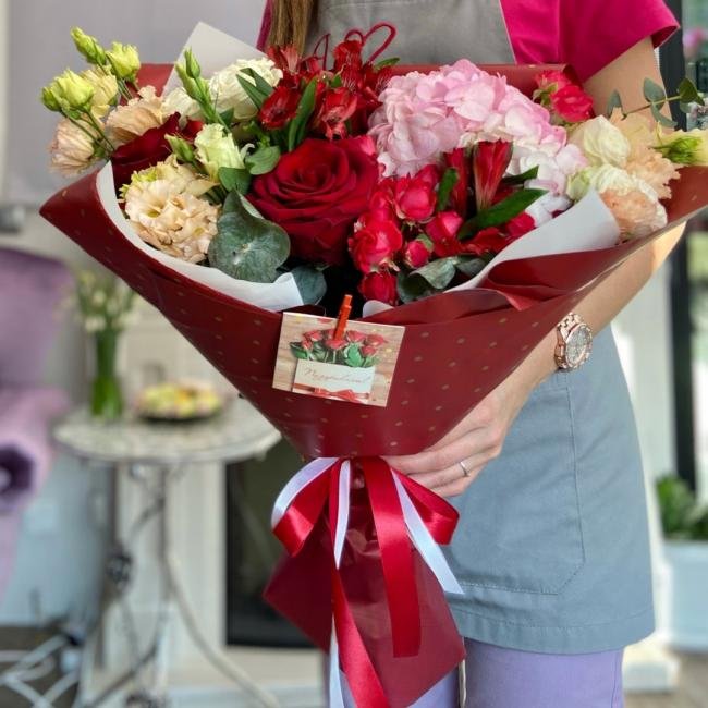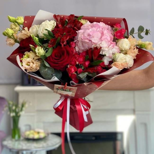 Описание В составе сборного букета: гортензия, одноголовая роза, кустовая роза, эустома, альстрамерия, эвкалипт.