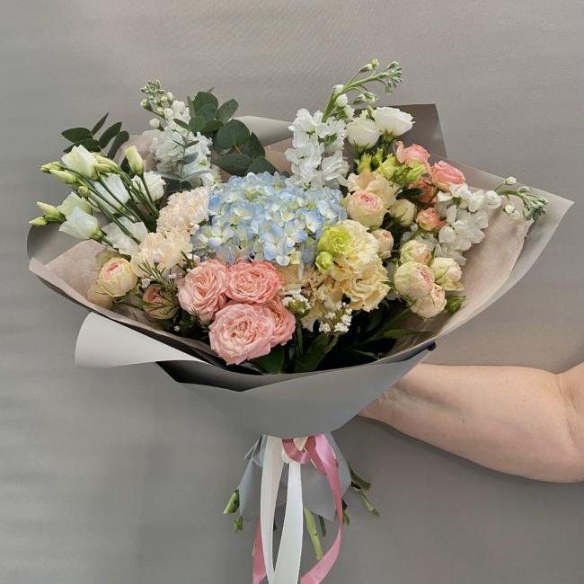 Описание В составе сборного букета: гортензия, кустовая роза, эустома, матиола, статица, хамелациум, эвкалипт.