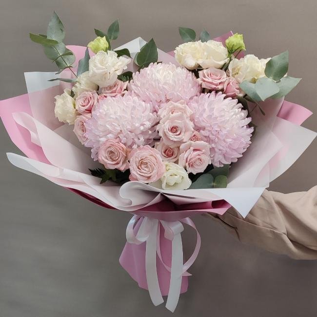 Описание В составе сборного букета: хризантема, кустовая роза, эустома, эвкалипт.