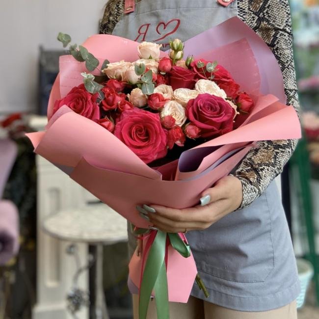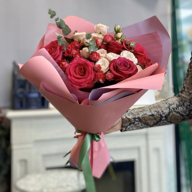 Описание В составе сборного букета: роза эквадор, кустовая роза, эвкалипт.