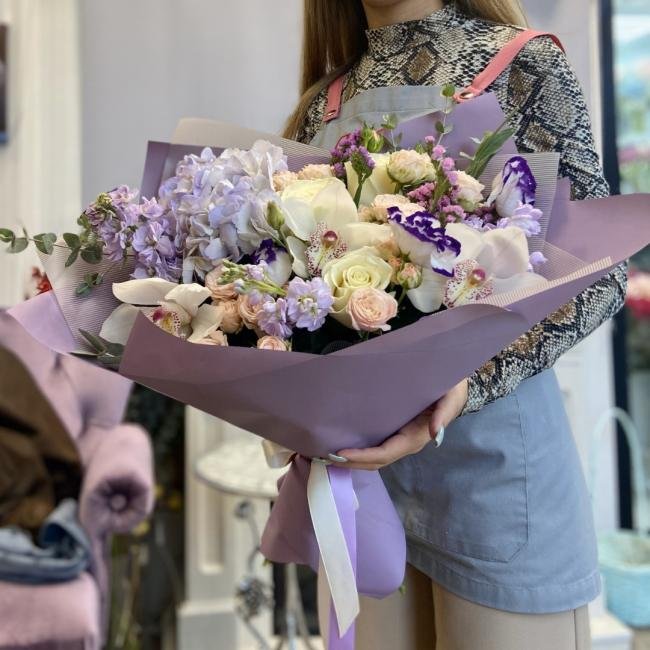 Описание В составе сборного букета: гортензия, кустовая роза, эустома, орхидея, статица, матиола, зелень