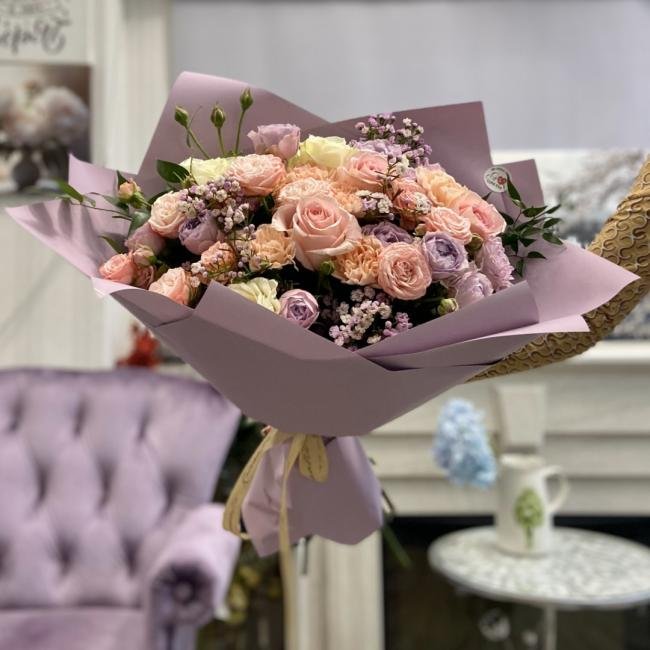 Описание В составе сборного букета: роза, кустовая и пионовидная роза, диантус, хамелациум, зелень.