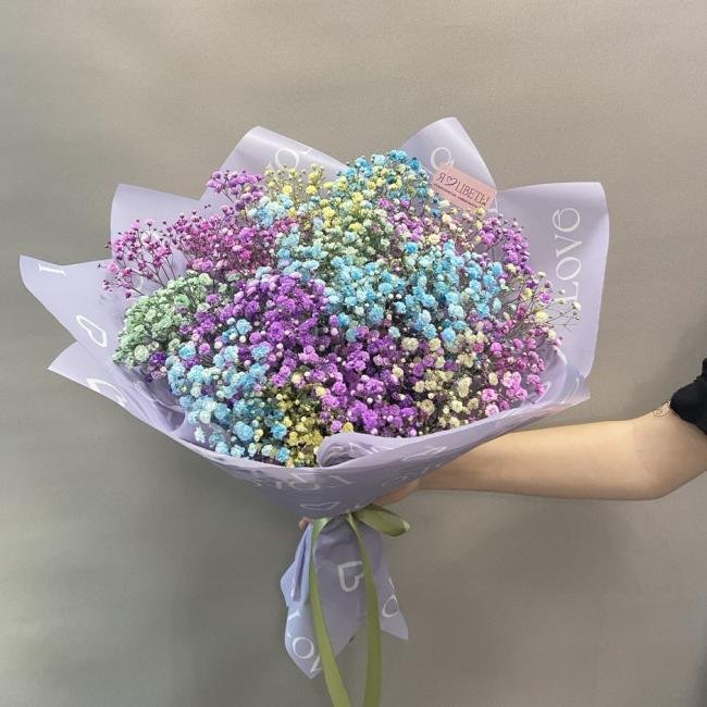 Описание Букет из воздушной гипсофилы радует не только своей красотой и нежность, но и стойкостью. Ведь гипсофила без воды превратится в сухоцвет и будет радовать еще очень-очень долго.