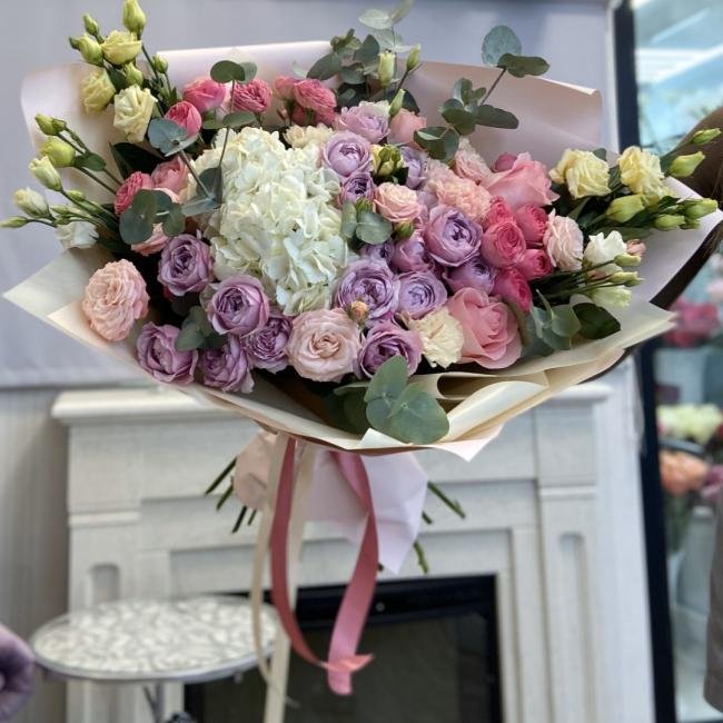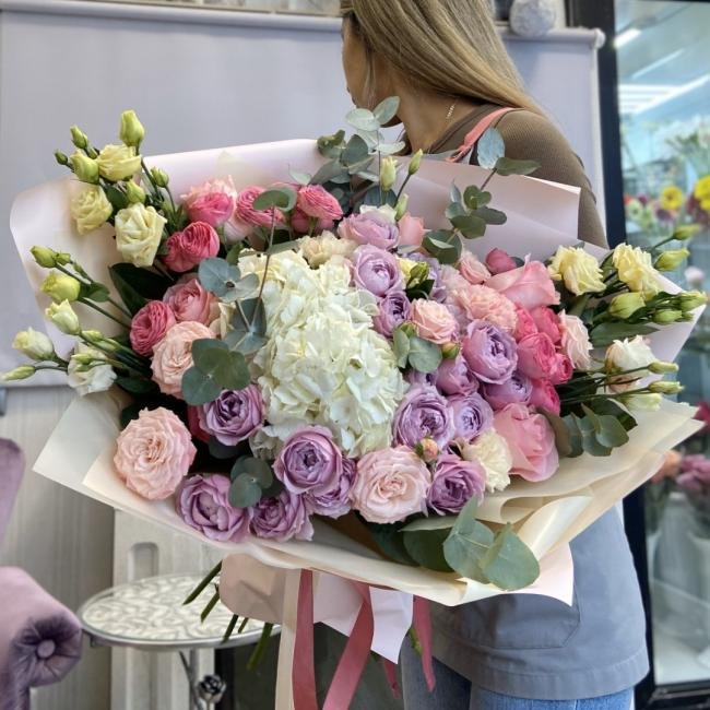 Описание В составе сборного букета: гортензия, кустовые и пионовидные розы. эустома, эвкалипт.