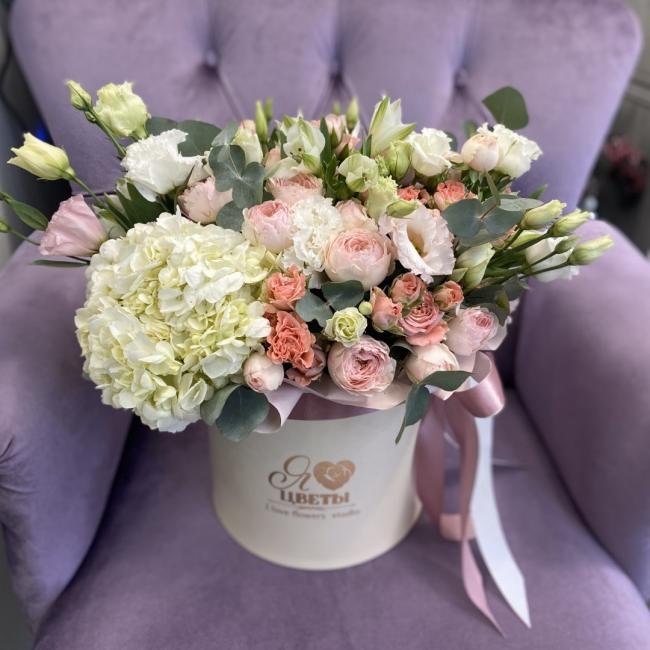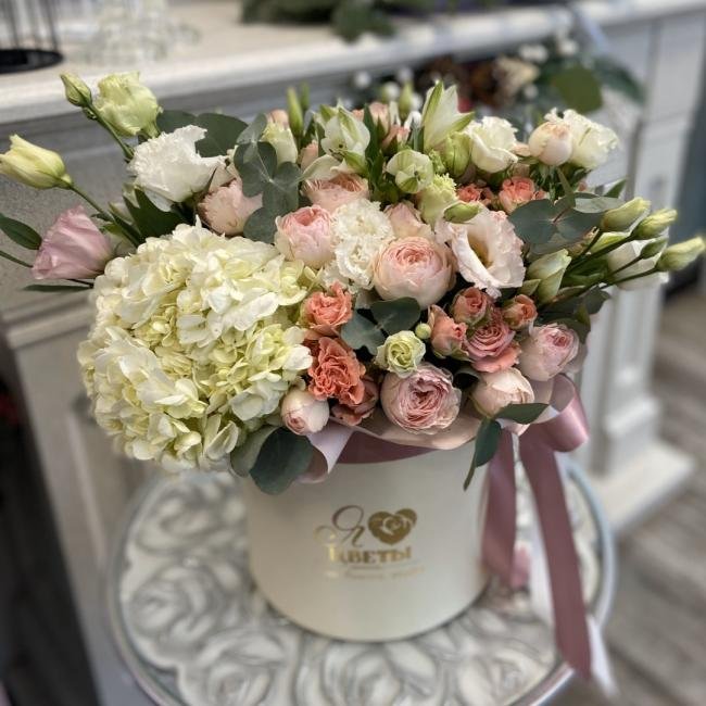 Композиция цветов #65 в шляпной коробке «Ребекка»