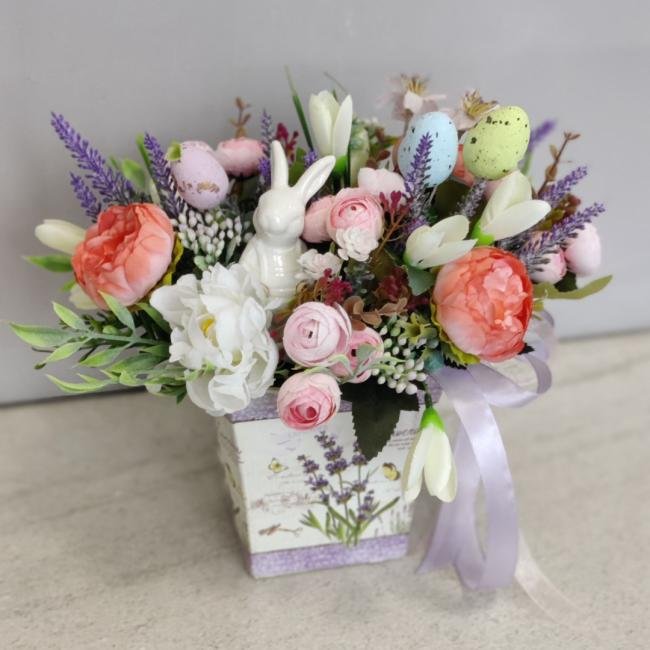 Описание Композиция из искусственных цветов на праздник Пасха.