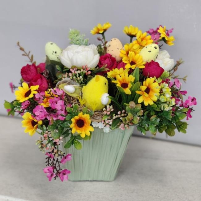 Описание Композиция из искусственных цветов на праздник Пасха.