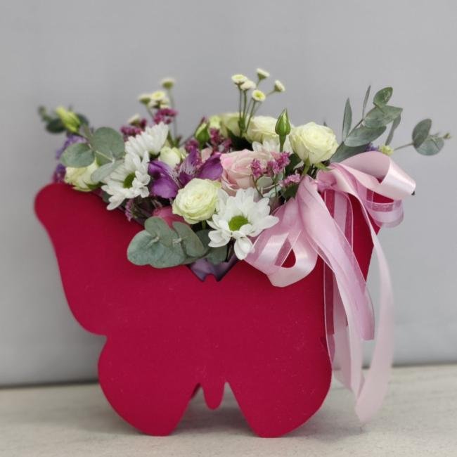 Композиция цветов #76 в деревянной коробке «Бабочка»