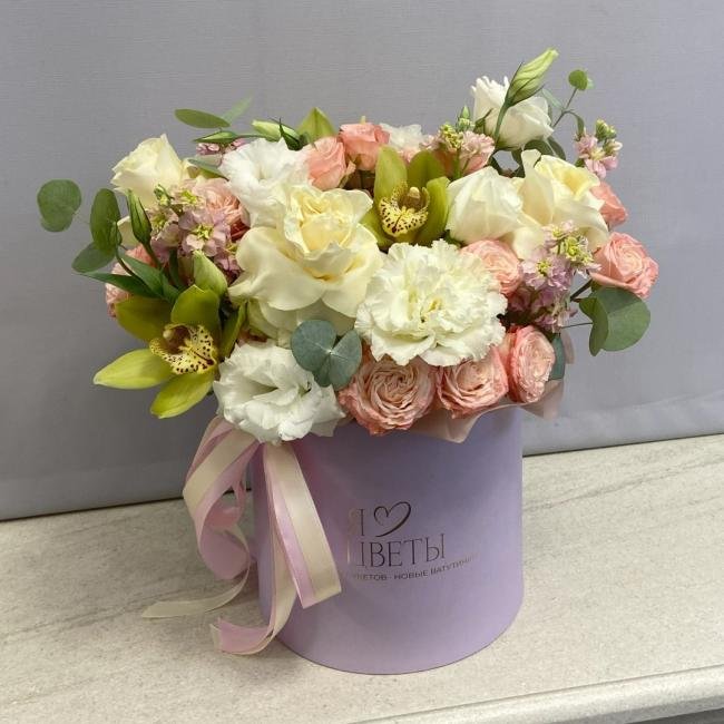 Композиция цветов #78 в шляпной коробке «Габриэлла»