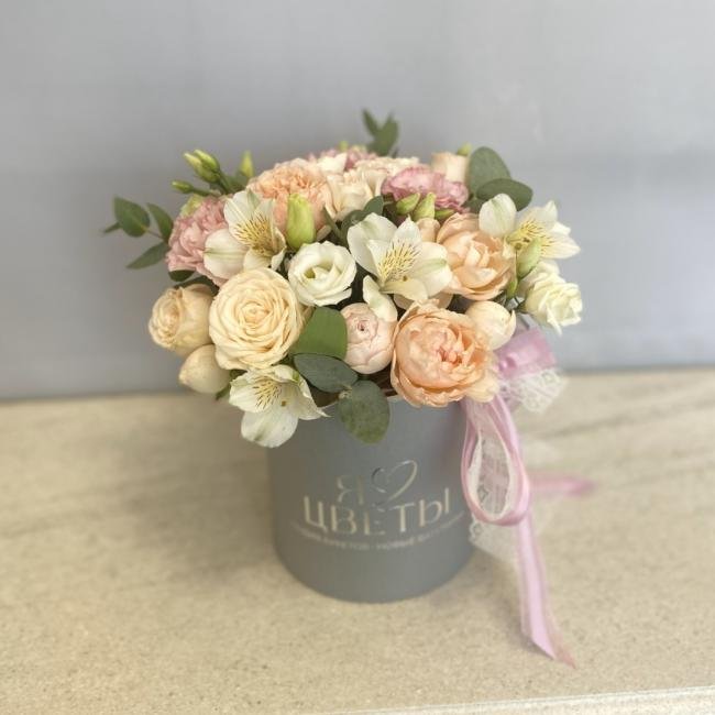 Композиция цветов #84 в шляпной коробке «Лукреция»