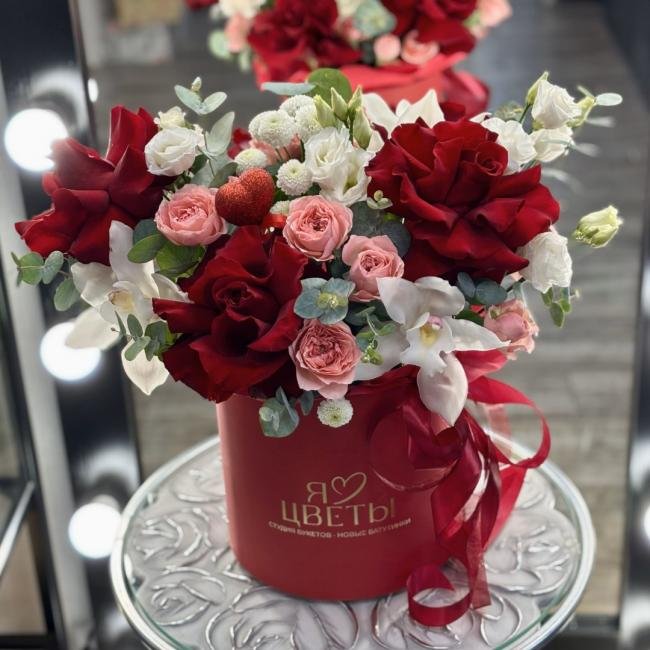 Композиция цветов #89 в шляпной коробке «Нереза»