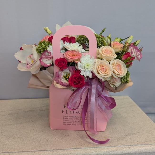 Описание В составе: орхидея, кустовая роза, кустовая хризантема, эустома, зелень