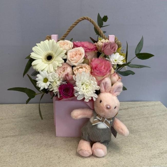 Описание Игрушка входит в комплект. В составе композиции: гербера, кустовая хризантема, кустовая роза, зелень