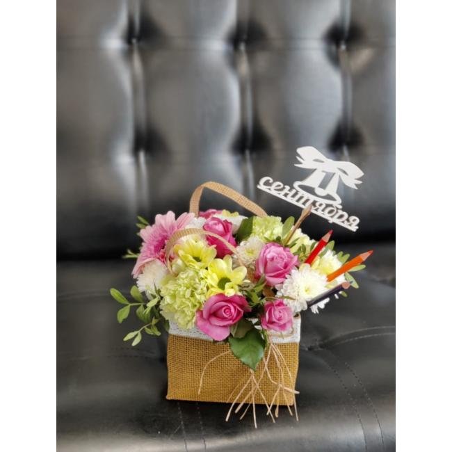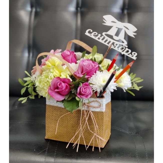 Композиция цветов #13 в сумочке «Первоклашка»
