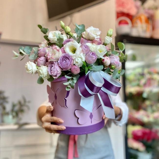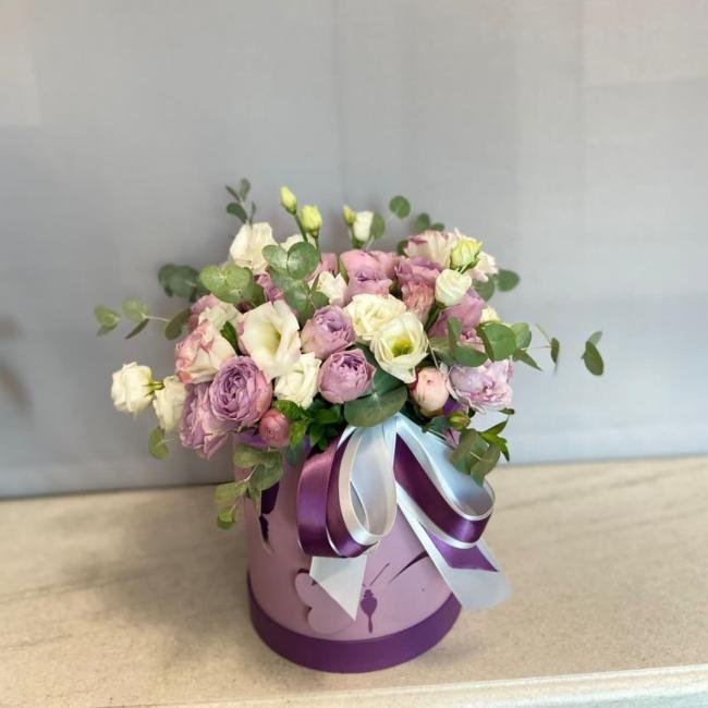 Описание Композиция в шляпной коробке "Виола" не оставит равнодушным ! Она способна украсить любое событие! Стильная коробочка подойдет в подарок любой представительнице женского пола. Выдержанная в спокойных оттенках, композиция при этом очень жизнерадостная