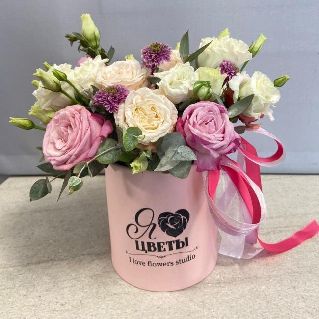 Описание Композиция в шляпной коробке «Милагрос» нежная, но с нотками страсти! Очарует и останется навсегда в сердце! Сантини с эвкалиптом эффектно подчеркивают нежность эустомы и прелесть кустовой розы! Плюс брендовая коробочка подчеркнет статус подарка!
