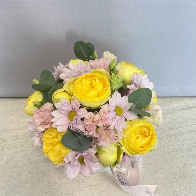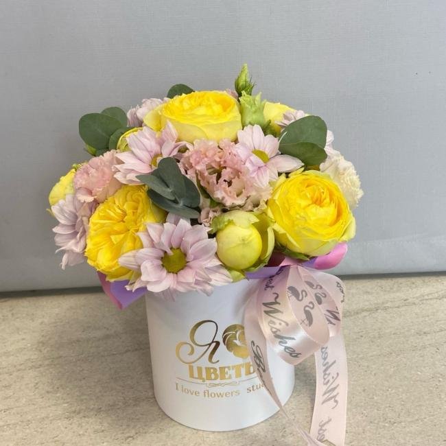 Композиция цветов #22 в шляпной коробке «Мишель»