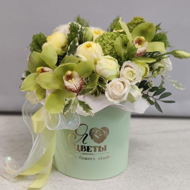 Композиция цветов #27 в шляпной коробке «Мохито»