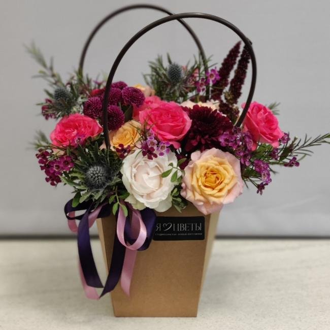 Композиция цветов #39 в сумочке «Венсдей»