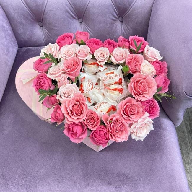 Описание Коробка в форме сердца с кустовыми розами и конфетами "рафаэлло"