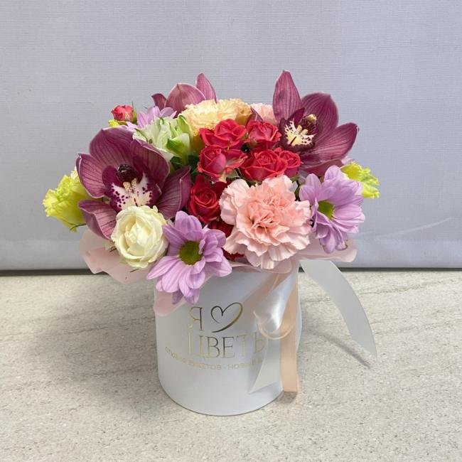 Композиция цветов #45 в шляпной коробке «Камилла»