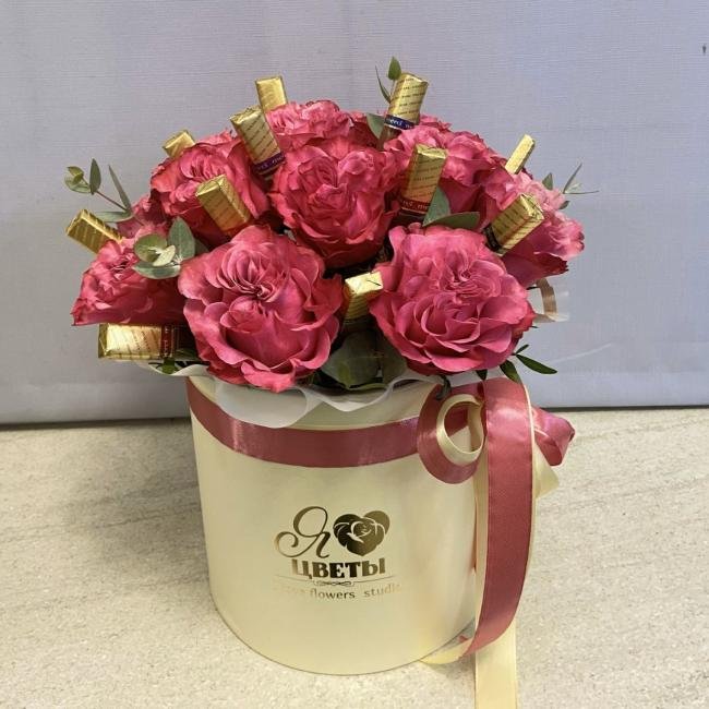 Композиция цветов #47 в шляпной коробке с конфетами «Фиби»