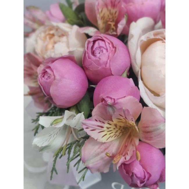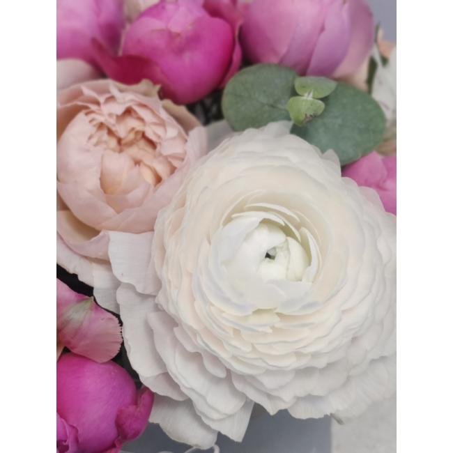 Описание В составе композиции: ранункулюс, пионовидная роза, альстрамерия, эвкалипт.