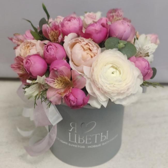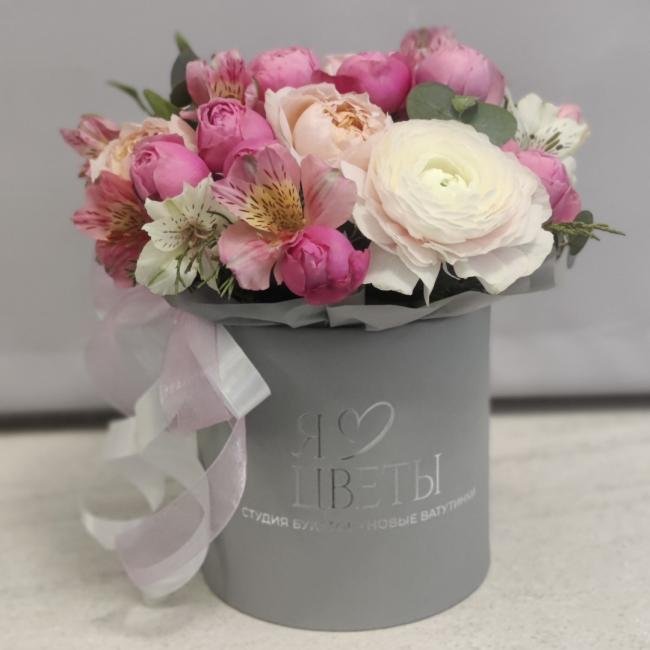 Композиция цветов #52 в шляпной коробке «Кармен»