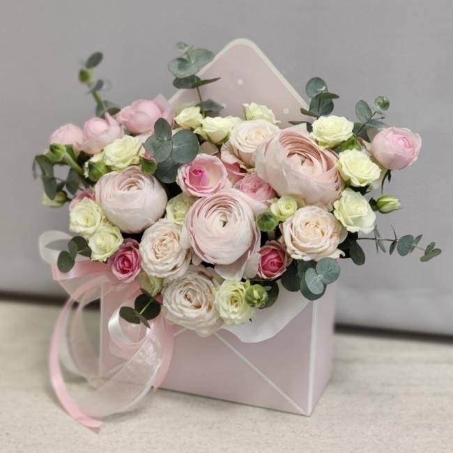 Описание В составе композиции: ранункулюс, кустовые розы, эвкалипт
