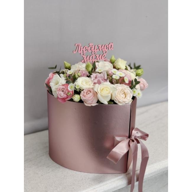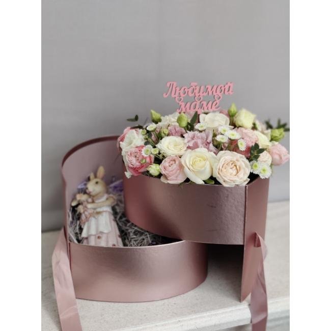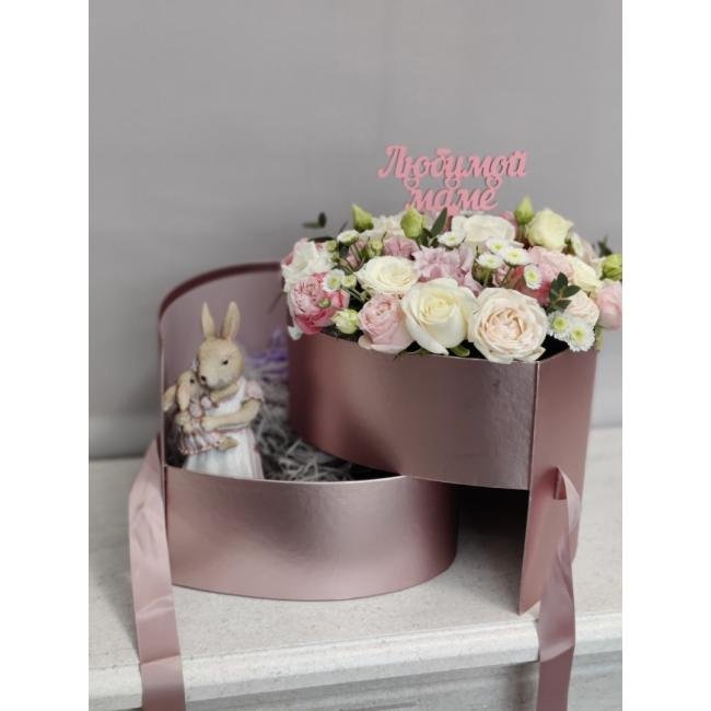 Описание Цветочная композиция в виде сердца, в нижней части коробки находится сюрприз для получателя. Это может быть статуэтка или пирожное. Такая композиция будет не только букетом,а полноценным подарком.