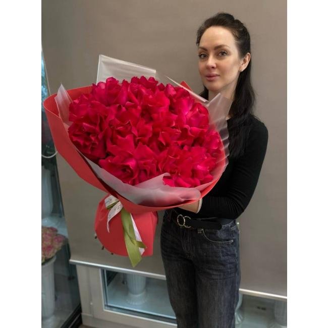 Описание Объемный и шикарный букет из 17 французской розы сорта Эквадор Готча.