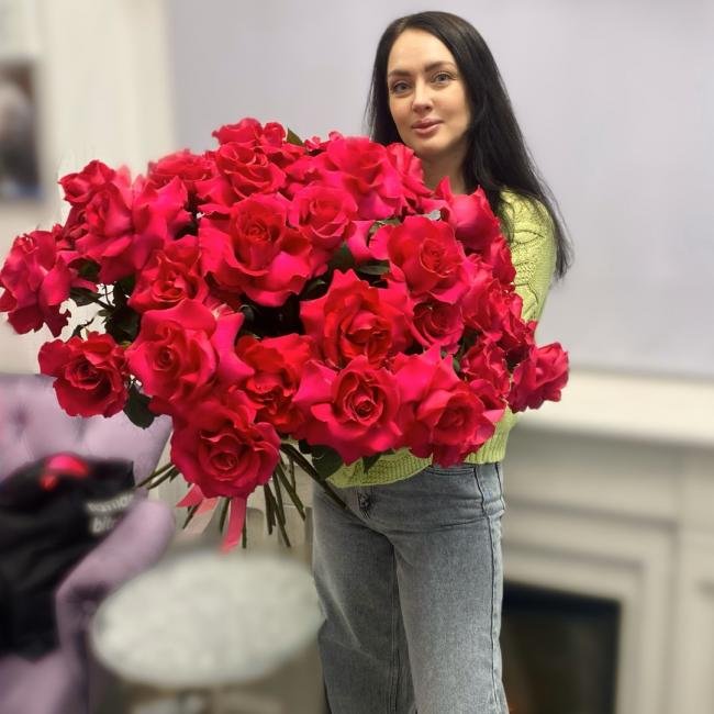 Описание Объемный и шикарный букет из 31 французской розы сорта Эквадор Готча.